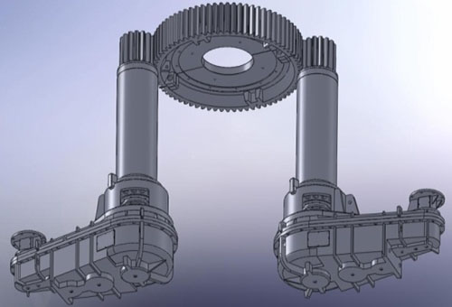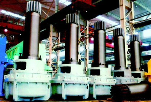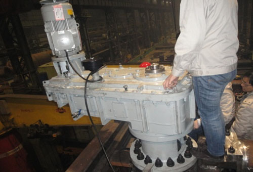 傳動(dòng)裝置由減速機(jī)、輸出齒輪軸、偏心套組件及填料環(huán)組件等幾部分組成。減速機(jī)由變頻調(diào)速電機(jī)經(jīng)限力聯(lián)軸器直接驅(qū)動(dòng),通過(guò)5級(jí)硬齒面圓柱齒輪傳動(dòng),由內(nèi)花鍵軸傳遞給輸出齒輪軸。偏心套、滑動(dòng)軸套和填料環(huán)裝配后經(jīng)聯(lián)結(jié)法蘭和減速機(jī)一起把合在爐體上??赏ㄟ^(guò)調(diào)整減速機(jī)和偏心套的相對(duì)把合位置來(lái)調(diào)整開(kāi)式齒輪傳動(dòng)的中心距以補(bǔ)償由于高溫產(chǎn)生的形變