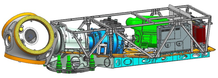 在國內(nèi)較早提出并應(yīng)用發(fā)電系統(tǒng)(發(fā)電機(jī)、變流器、干式升壓變壓器)上置技術(shù),集成電氣系統(tǒng)、冷卻系統(tǒng),機(jī)械承載結(jié)構(gòu)與動力學(xué)分析。具有電纜數(shù)量少、易施工、塔內(nèi)線損少等優(yōu)勢,免除箱變土建,減少整機(jī)和風(fēng)電場綜合成本。