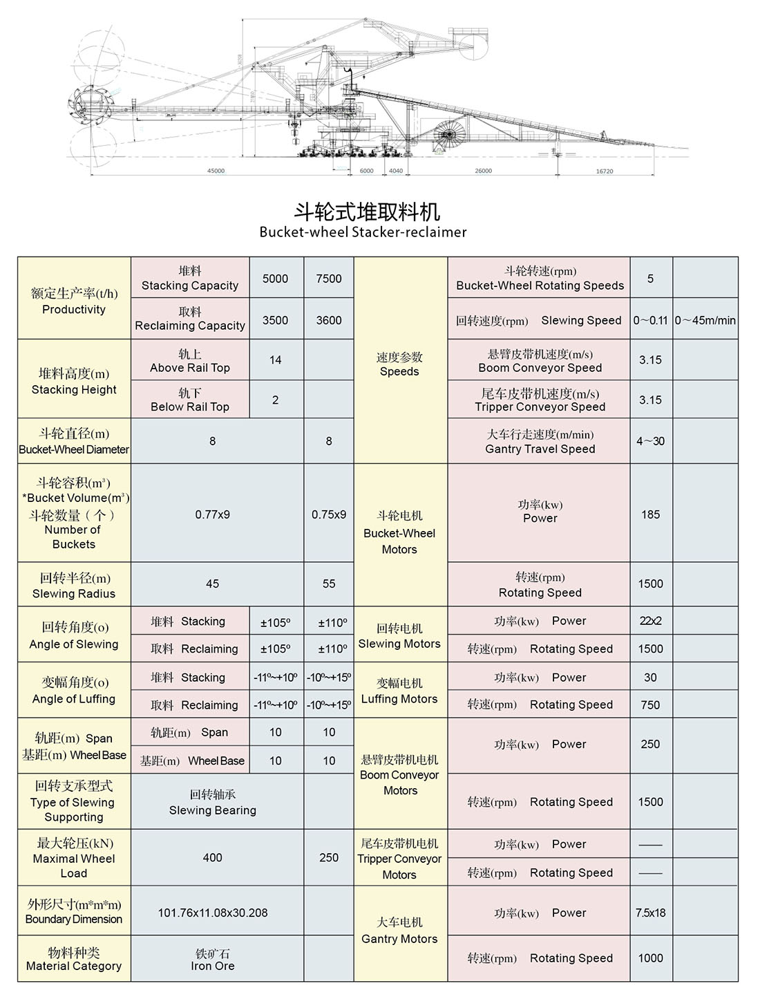斗輪堆取料機(jī),兼有堆料與取料功能的大型高效率連續(xù)式機(jī)械。主要由斗輪取料機(jī)懸臂膠帶運(yùn)輸機(jī),運(yùn)行機(jī)構(gòu),回轉(zhuǎn)機(jī)構(gòu),變幅機(jī)構(gòu)和尾車架部分組成。可按客戶需求制造不同規(guī)格的堆料機(jī)、取料機(jī)、堆取料機(jī)。