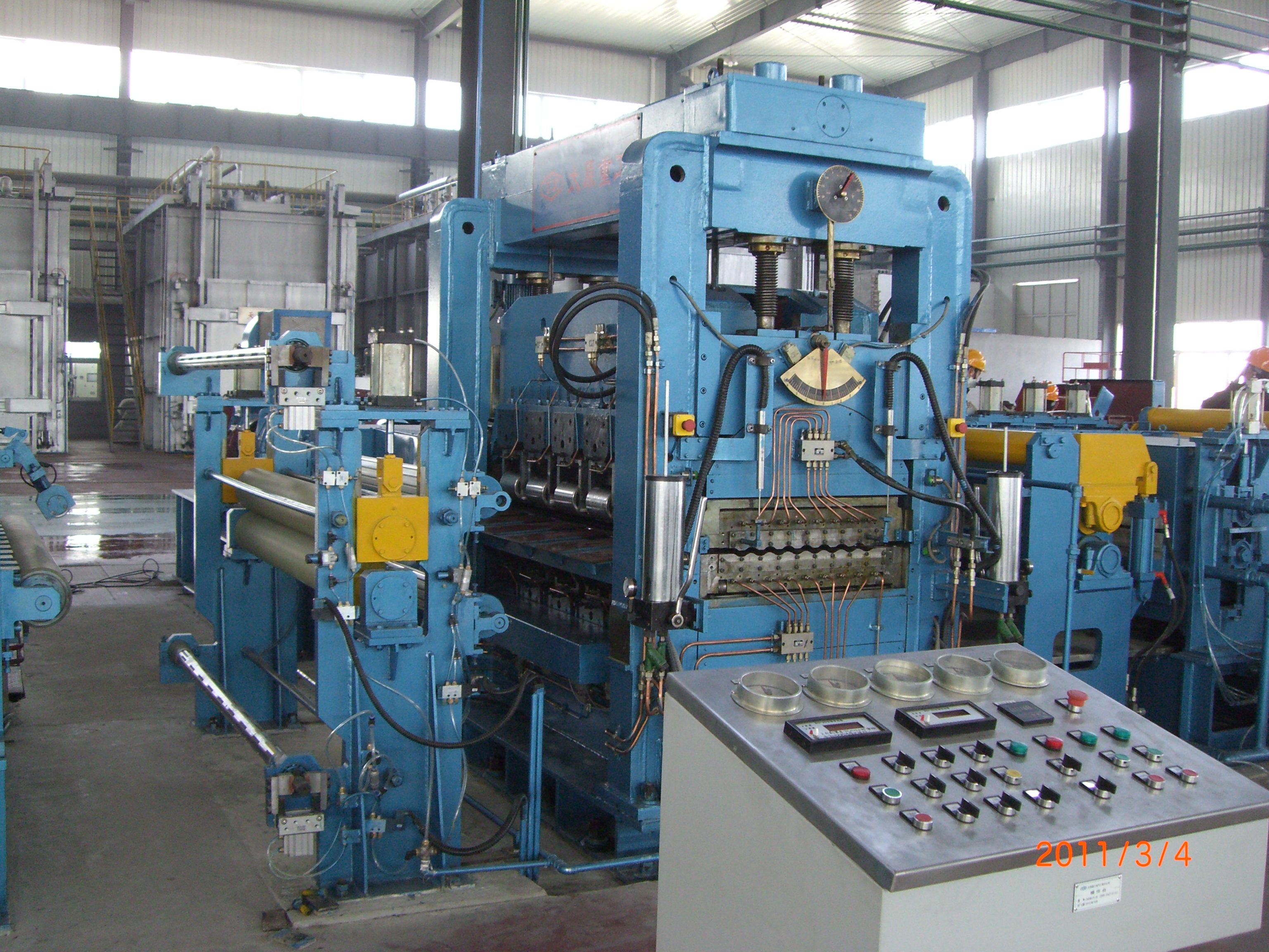 5輥中厚板、寬厚板預(yù)矯正機(jī)可用于矯正厚度6-60mm 的低合金高強(qiáng)度鋼板、高強(qiáng)度工程機(jī)械用鋼、優(yōu)質(zhì)碳素結(jié)構(gòu)鋼板,布置在精軋機(jī)預(yù)冷卻設(shè)備之間,初步矯平需要控制鋼板的冷卻速度,提高冷卻操作的安全性及冷卻效果。7輥全液壓矯直機(jī)用于矯正厚度為25-35mm、需要感應(yīng)加熱的不銹鋼板,其壓下與彎輥均為液壓驅(qū)動(dòng),矯正后的鋼板整體不平度小于10mm,屬于最新結(jié)構(gòu)的不銹鋼板帶矯正機(jī)。