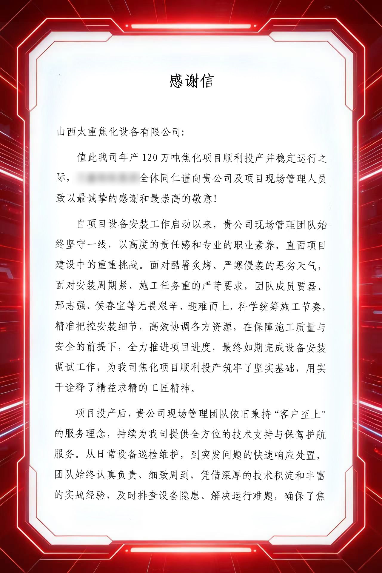 “過硬專業(yè)能力、頑強拼搏的工作作風和貼心細致的服務態(tài)度,讓我們深受感動?!苯?,某大型鋼鐵集團在發(fā)給太重的感謝信中,用這樣一段話,對太重焦化公司現(xiàn)場管理團隊在年產(chǎn)120萬噸焦化項目建設中的責任擔當給予高度評價。