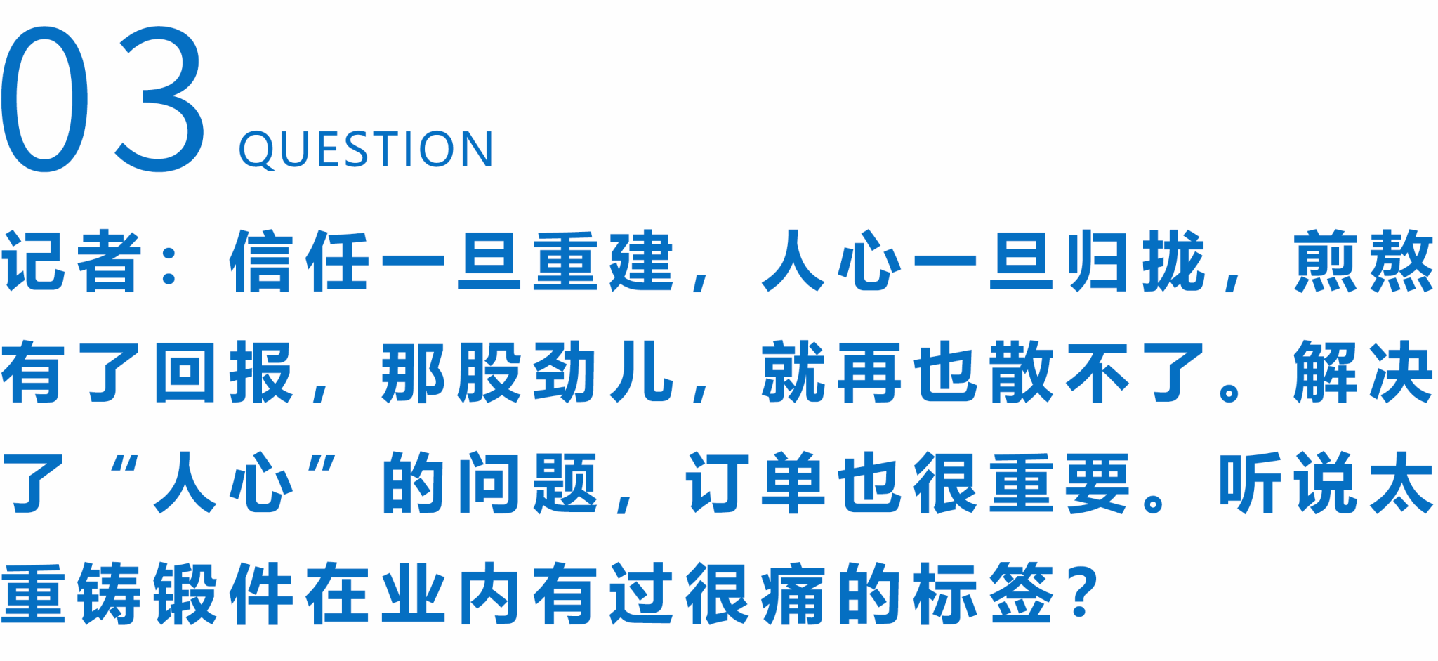 杜云崗:是的。當時咱們集團公司領(lǐng)導帶頭在用戶門外等了一個小時,結(jié)果等來的只有一句話:“和太重鑄鍛不打交道!”什么叫“積極主動”?就是人家把門關(guān)上了,你還想著怎么再敲開;就是用戶不讓你進門,還要在門外等那一小時。后來雙方關(guān)系才慢慢有了轉(zhuǎn)機。