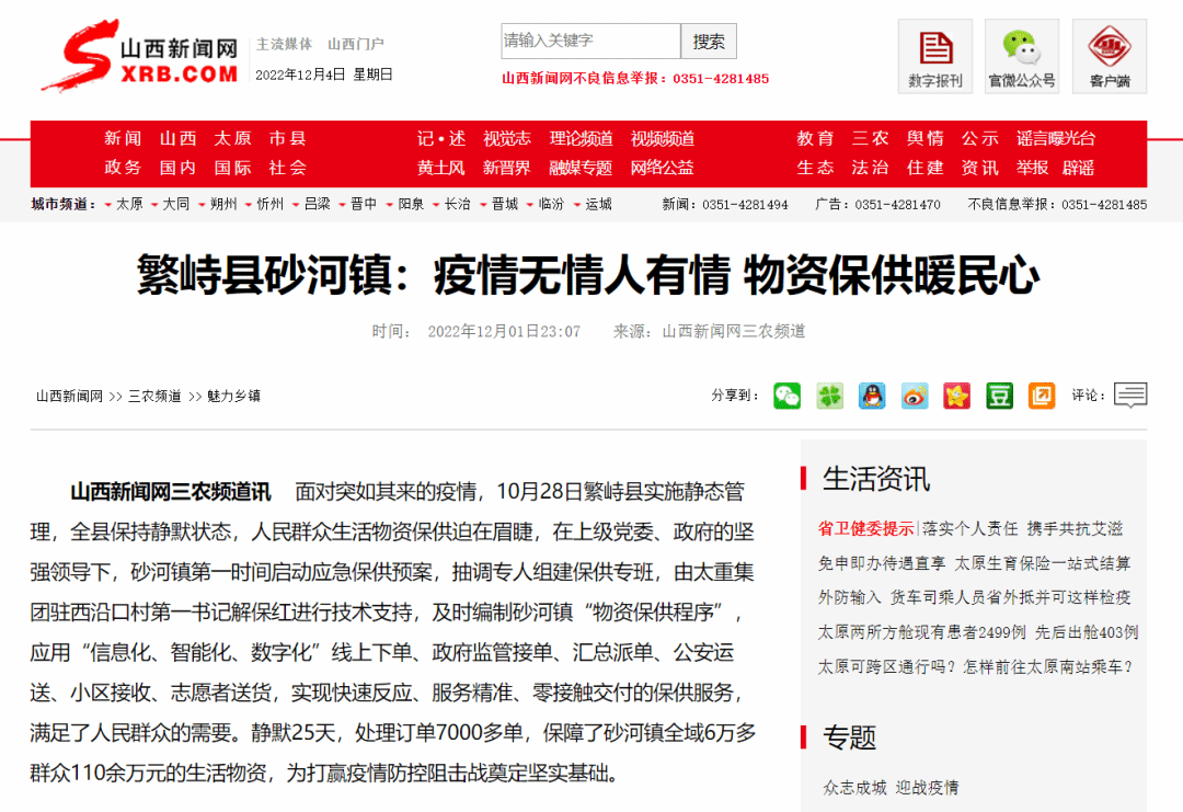 近日,山西新聞網(wǎng)刊發(fā)《繁峙縣砂河鎮(zhèn):疫情無情人有情 物資保供暖民心》文章,報道太重集團(tuán)駐村工作隊面對疫情嚴(yán)峻形勢,迅速響應(yīng)、積極應(yīng)戰(zhàn),協(xié)助砂河鎮(zhèn)高效快捷完成物資保供任務(wù),用行動扛起疫情防控責(zé)任,為打贏疫情防控攻堅戰(zhàn)貢獻(xiàn)國企力量。