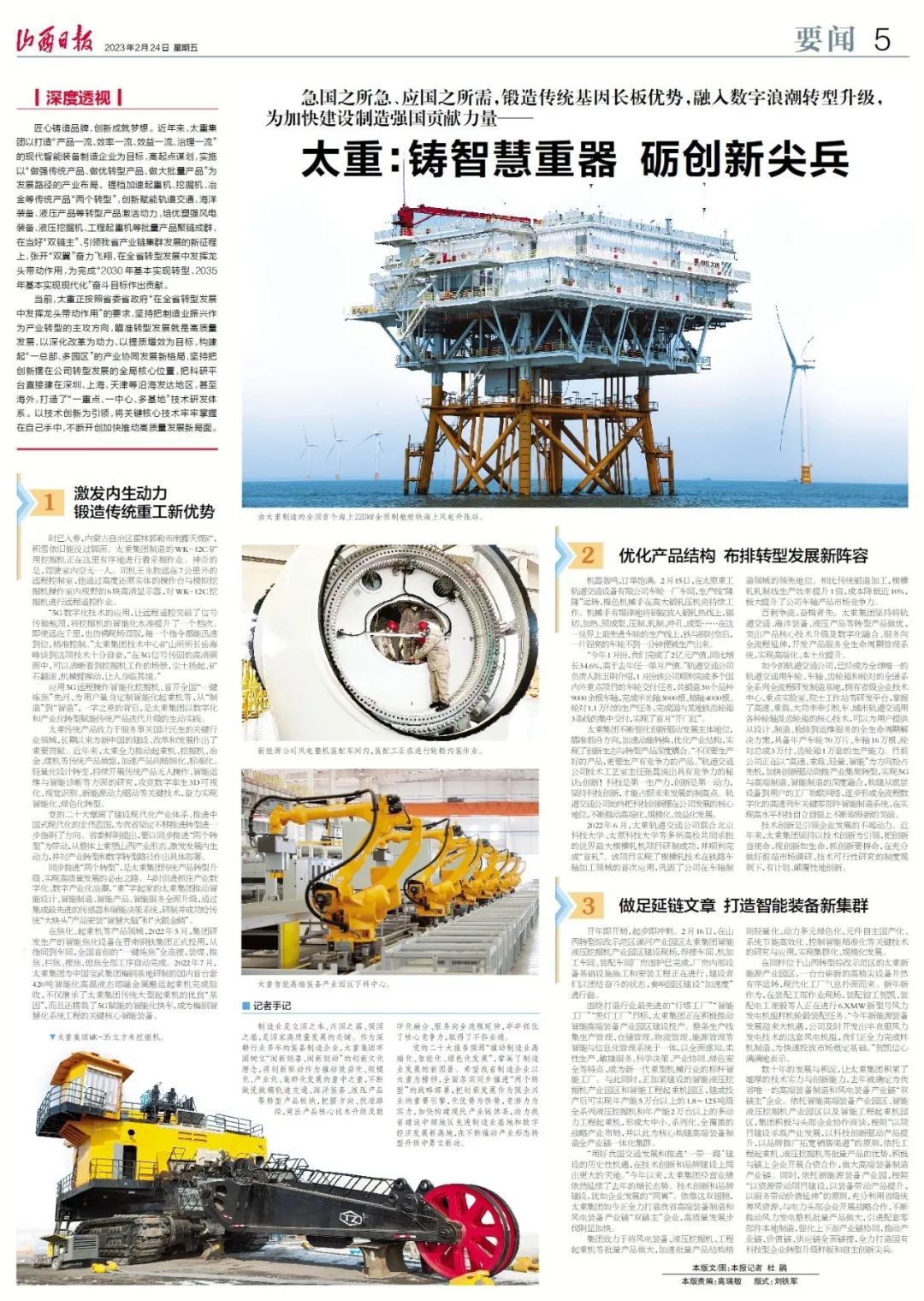 今日,山西日?qǐng)?bào)整版刊發(fā)《太重:鑄智慧重器 礪創(chuàng)新尖兵》文章,深入報(bào)道了太重集團(tuán)深耕智能制造,厚植創(chuàng)新發(fā)展的生動(dòng)實(shí)踐。作為全省唯一“雙鏈主”企業(yè),太重集團(tuán)以科技創(chuàng)新賦能轉(zhuǎn)型發(fā)展,探索科技創(chuàng)新和高端裝備制造產(chǎn)業(yè)深度融合的發(fā)展道路,為推動(dòng)中國“智”造、建設(shè)制造強(qiáng)國做貢獻(xiàn)。