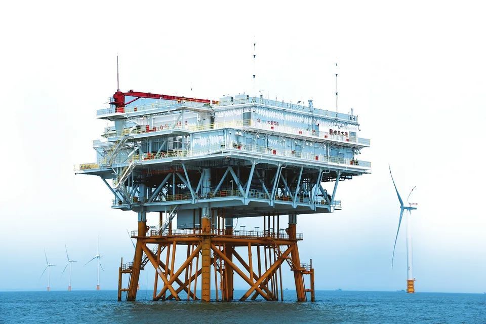 由太重制造的全國首個(gè)海上220kV全預(yù)制艙組塊海上風(fēng)電升壓站