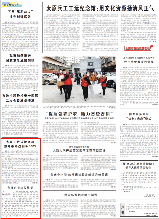 近期,太原日?qǐng)?bào)以《太重正鏟式挖掘機(jī)國(guó)內(nèi)市場(chǎng)占有率100%》為題對(duì)太重集團(tuán)礦用挖掘機(jī)勇登行業(yè)“塔尖”進(jìn)行報(bào)道。太重集團(tuán)大力實(shí)施科技創(chuàng)新和人才強(qiáng)企戰(zhàn)略,堅(jiān)持把創(chuàng)新擺在公司轉(zhuǎn)型發(fā)展全局的核心位置,為太重在全省轉(zhuǎn)型發(fā)展中發(fā)揮龍頭帶動(dòng)作用聚力賦能。