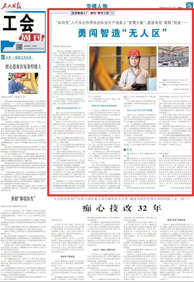 近日,《工人日報(bào)》對(duì)太重軌道公司設(shè)備能源室技術(shù)主辦宋志偉勇于創(chuàng)新、勇闖智造“無人區(qū)”,為高鐵打造合格“跑鞋”的先進(jìn)事跡進(jìn)行了聚焦報(bào)道。從覺醒成為一名新時(shí)代的工人到“雙師型”人才的突破,再到勇闖“無人區(qū)”,為生產(chǎn)線裝上了“智慧大腦”,宋志偉不斷攀登科研技術(shù)高峰,攻克多項(xiàng)科技創(chuàng)新難點(diǎn),不斷用熱情和力量踐行著強(qiáng)國有我的青年擔(dān)當(dāng)。