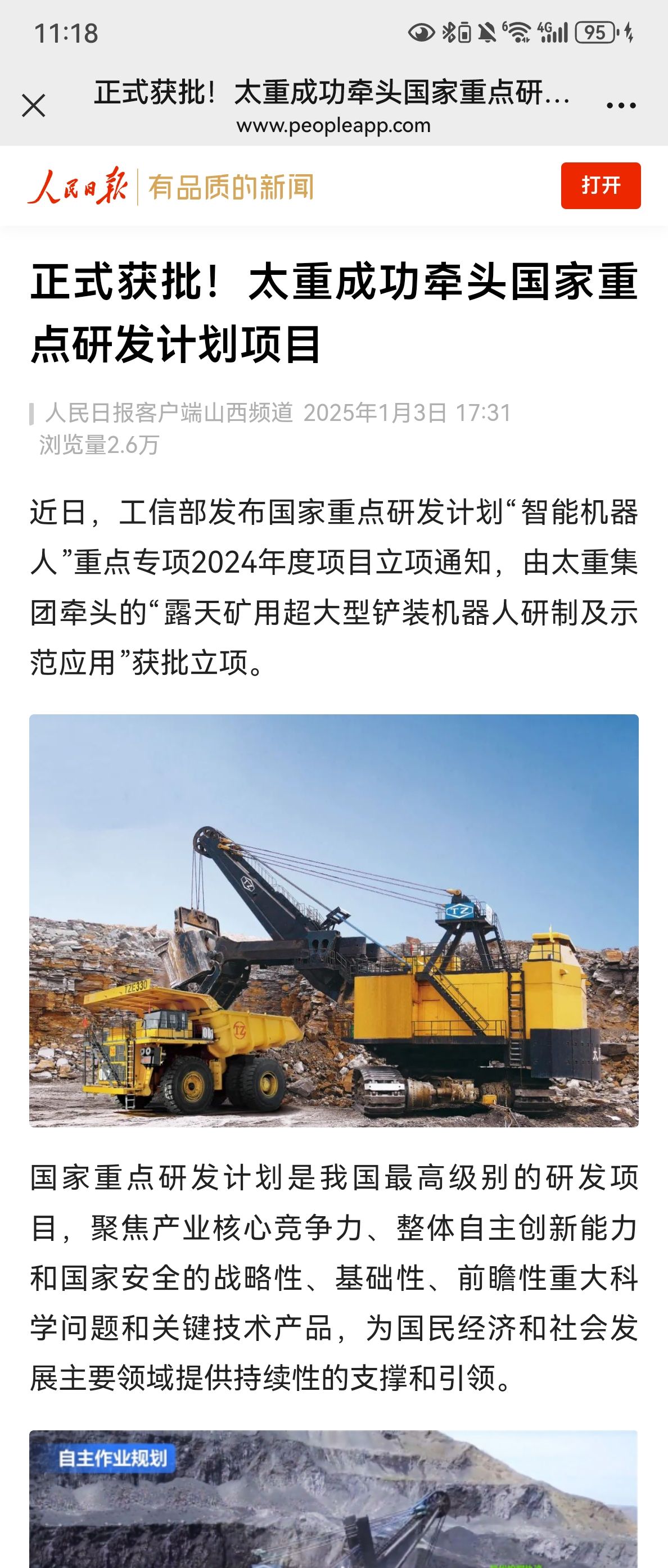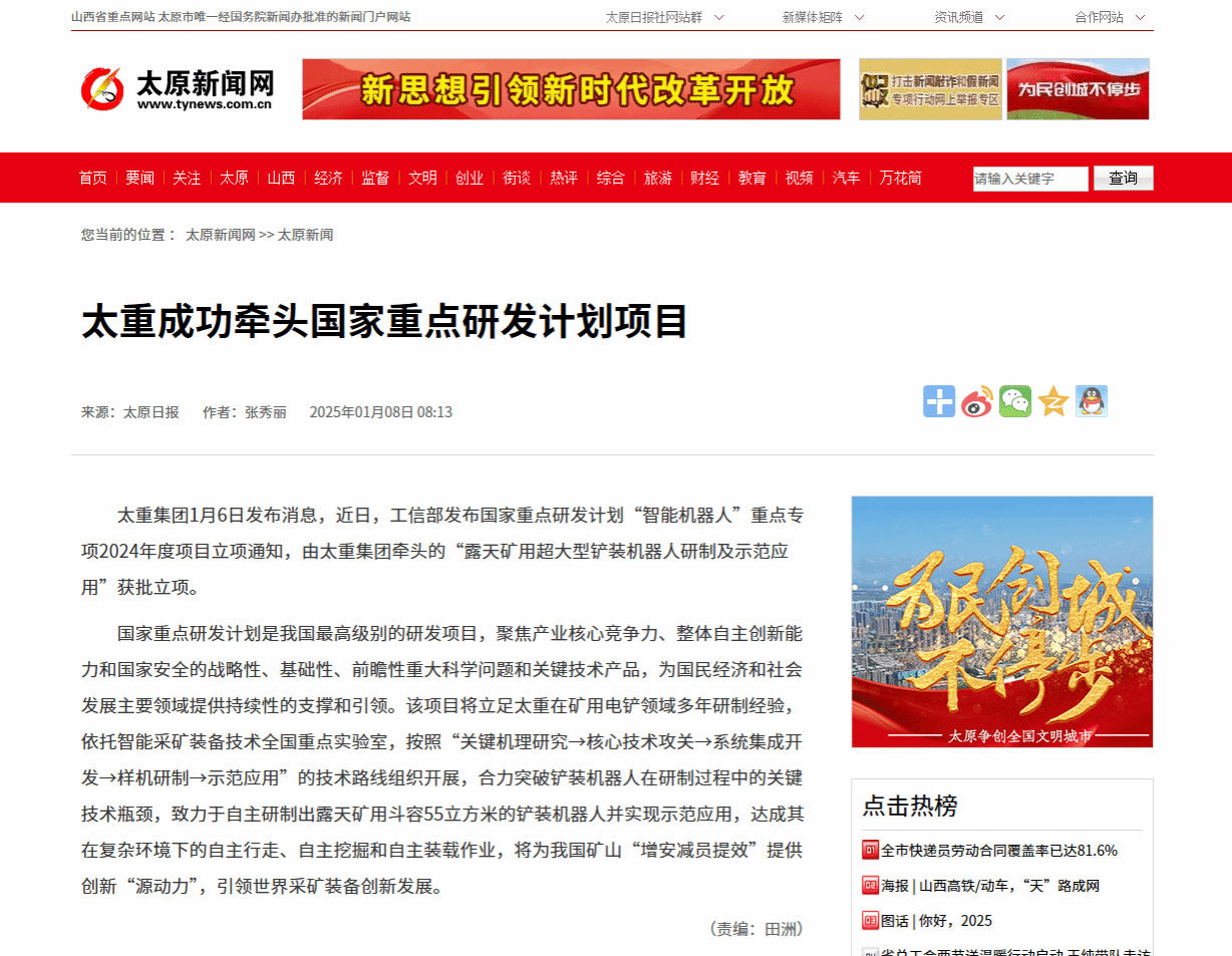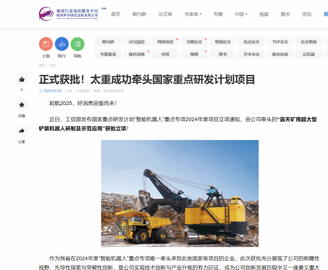 助力我國(guó)智慧礦山建設(shè),太重在行動(dòng)!近日,2024年度國(guó)家重點(diǎn)研發(fā)計(jì)劃立項(xiàng)結(jié)果公布,公司牽頭的“露天礦用超大型鏟裝機(jī)器人研制及示范應(yīng)用”獲批立項(xiàng)!太重集團(tuán)官微發(fā)布這一消息后,立刻受到人民日?qǐng)?bào)的重磅關(guān)注,彰顯出國(guó)家對(duì)太重科技創(chuàng)新能力的高度認(rèn)可。與此同時(shí),山西日?qǐng)?bào)、太原日?qǐng)?bào)、中國(guó)工程機(jī)械工業(yè)協(xié)會(huì)等主流媒體與行業(yè)平臺(tái)也迅速關(guān)注,紛紛轉(zhuǎn)發(fā)了太重這一重要突破,刷屏“朋友圈”!露天礦開采技術(shù)的全新智能化時(shí)代,在此啟航!