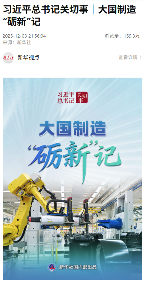 制造業(yè)是立國(guó)之本、強(qiáng)國(guó)之基。近日,新華社客戶端《習(xí)近平總書記關(guān)切事》專欄以《大國(guó)制造“礪新”記》為題,深度聚焦太重高端裝備制造,獲得廣泛關(guān)注,瀏覽量近160萬(wàn)。12月4日,該報(bào)道在《新華每日電訊》頭版頭條刊發(fā)。